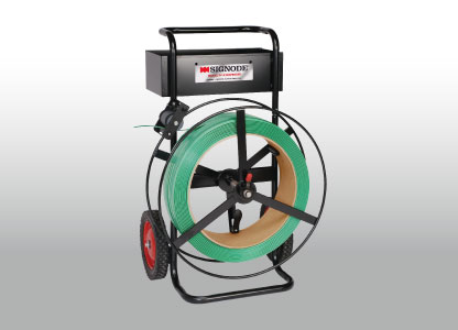 The Signode DF-15 Dispenser with hub extension can be used with either steel or poly/polyester strapping, in strap sizes 3/8`` to 3/4``. This strapping dispenser feeds from the outside and is portable for easy mobility.